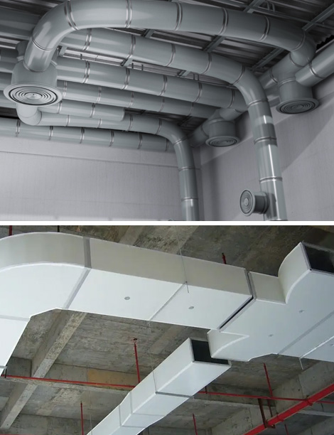 GI ducts are made from galvanized iron sheets, coated with zinc to prevent rust and corrosion. They are a popular choice due to their strength, durability, and fire resistance.
